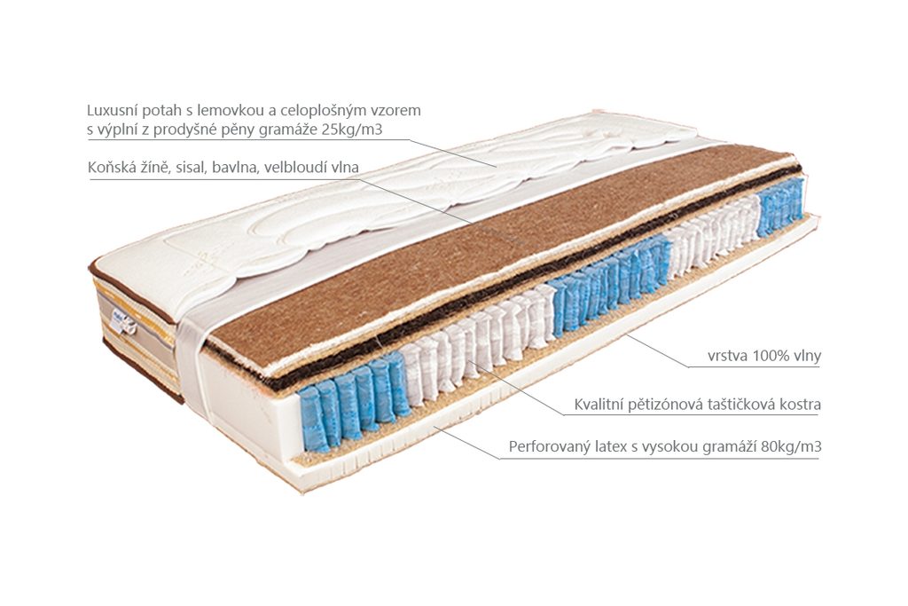 Základem matrace je vrstva z taštičkových pružin, kterou tvoří 770 ks pružinek umístěných v jednotlivých látkových taštičkách. Výhodou tohoto zpracování je možnost reagování každé pružinky nezávisle na té druhé. Tudíž při stlačení jedné pružiny, zůstanou ostatní v nehnutém stavu. Pružinový střed je poté z každé strany doplněn několika vrstvami přírodních materiálů. Matrace je tedy oboustranná a dělí se na letní a zimní stranu. Letní stranu tvoří vrstva sisalu, koňské žíně, 100% bavlny a 100% velbloudí vlny. Zimní stranu pak tvoří perforovaný latex s vysokou gramáží 80 kg/m3, sisal a vrstva 100% ovčí vlny. Přírodní materiály, které byly použity při výrobě matrace Yana, dávají matraci specifické vlastnosti. Ovčí a velbloudí fungují jako regulátor teploty. Mají taktéž schopnost vysoké absorbce a případně schopnost uvolňování vlhkosti, tudíž dokáží v létě chladit a v zimě hřát. Koňská žíně dokáže pojmout velké množství vlhkosti, aniž by to bylo při doteku znát. Tuto vlhkost opět uvolní, když zrovna neležíte. Latexová vrstva působí navíc antibakteriálně, neboť přírodní latex vytváří nevhodné prostředí pro život roztočů. Použité materiály jsou 100% rostlinného či živočišného původu a proto své specifické aroma, které mohou někteří jedinci vnímat citlivěji ale někteří ho vůbec nezaregistrují. Specifické aroma není závadou a časem se vytrácí. Tuto skvělou matraci si můžete vybrat v ručně vyrobeném potahu, který nabízíme v provedeních: Bambus a Silver. Doporučujeme Vám dokoupit k matraci také rošt nebo postel z naší bohaté nabídky.