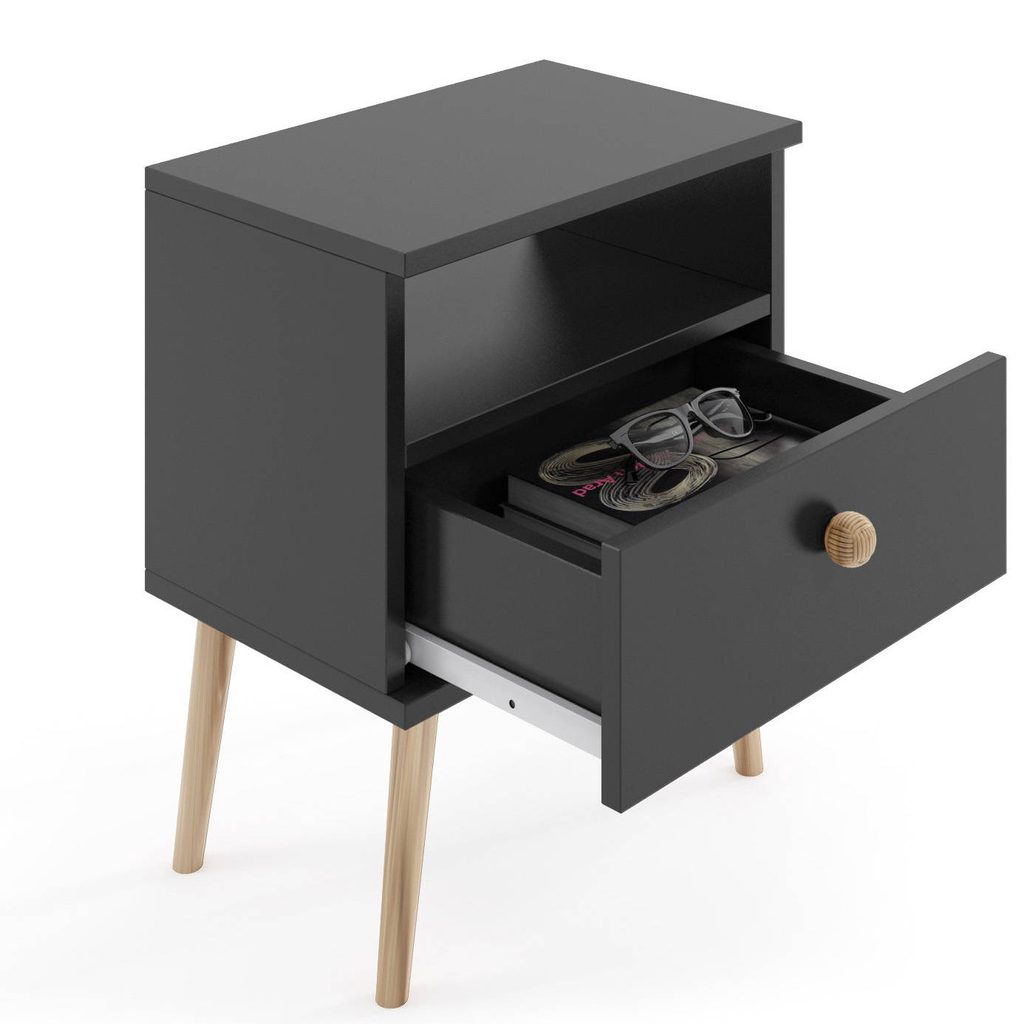 Nožky vyrobené z masivního bukového dřeva dodávají nočnímu stolku stabilitu a příjemný přírodní prvek. Šuplík nabízí skrytý úložný prostor pro vaše osobní věci, zatímco otevřená polička je ideální pro knihy, časopisy nebo dekorace.