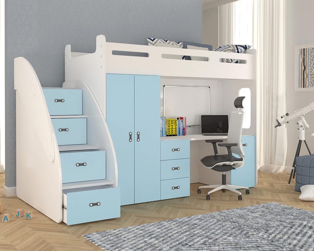 Pod horním lůžkem se nachází prostorná dvoudveřová skříň, ideální na oblečení, hračky i školní potřeby. Součástí sestavy je také psací stůl se šuplíky a skříňkou – perfektní místo pro domácí úkoly, tvoření nebo počítač.