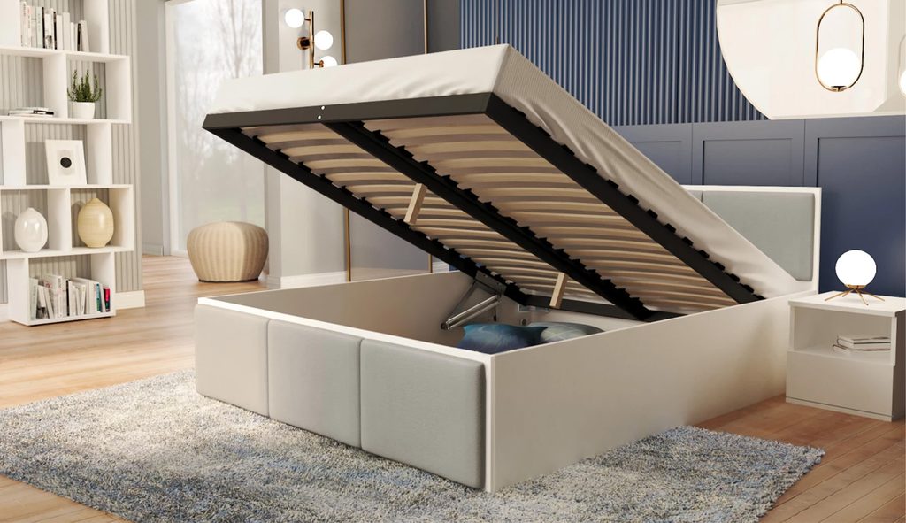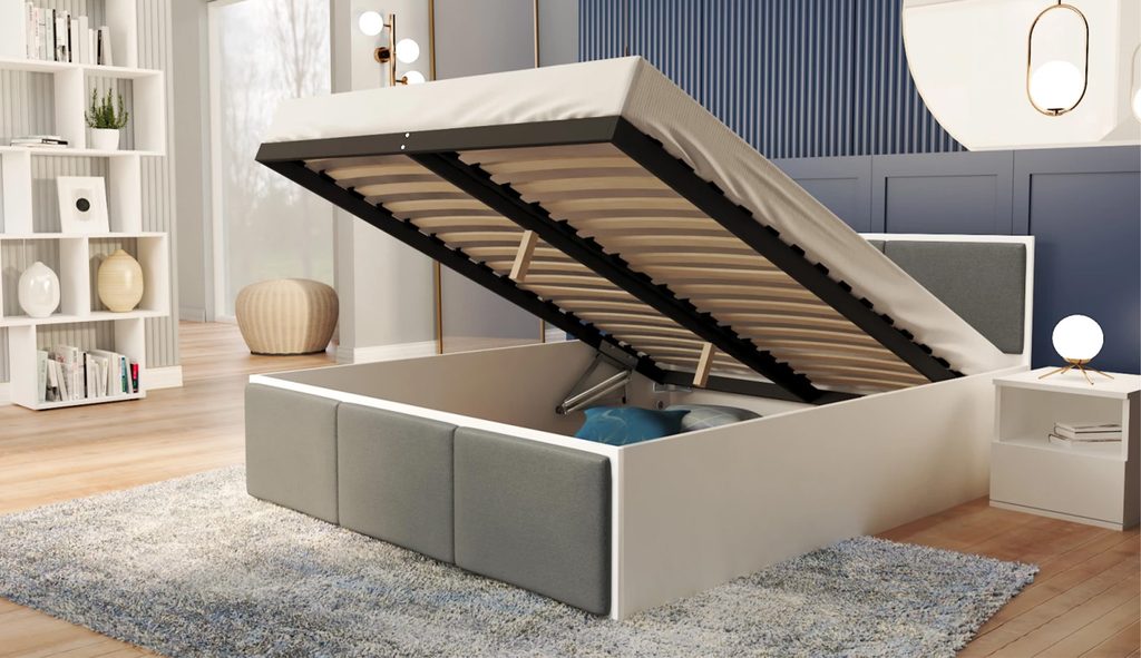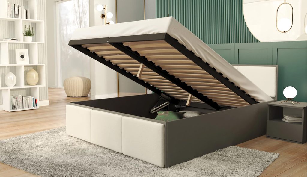 Pod matrací se nachází velký úložný prostor, který přiléhá ke zemi a je vhodný i pro těžší předměty – od sezónních textilií až po objemné deky. Otevírá se pomocí systému výklopného roštu, který umožňuje komfortní přístup ke všem uloženým věcem.