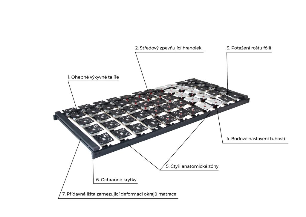 Lehací plochu roštu tvoří výkyvné talíře, které podepírají tělo v každém bodu, rovnoměrně reagují na zátěž a přizpůsobí se jakýmkoliv tělesným proporcím. Individuální regulace tuhosti talířů v ramenní a bederní oblasti - 2 stupně tuhosti. Přídavná lišta rovnoměrně podpírá matraci po celé ploše.