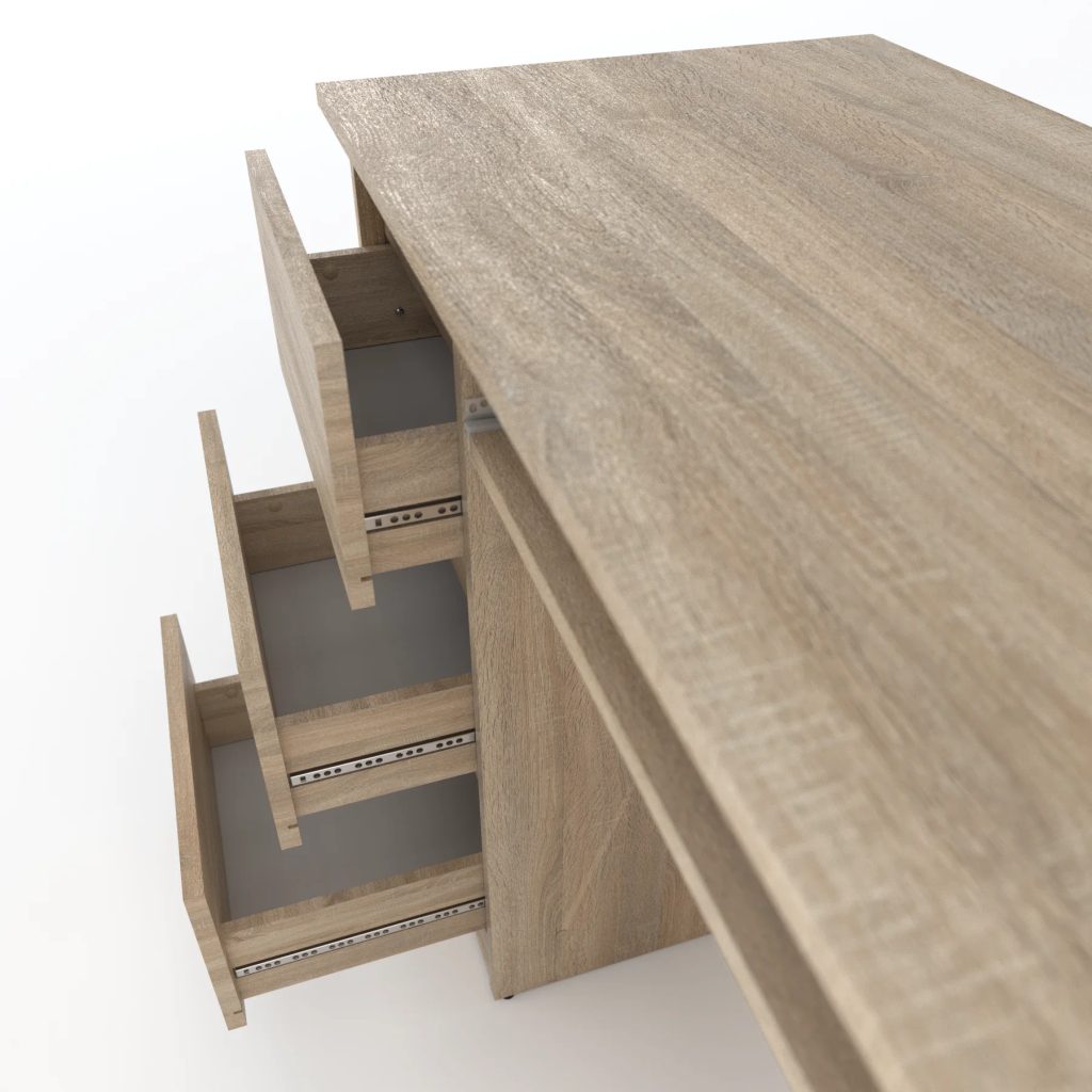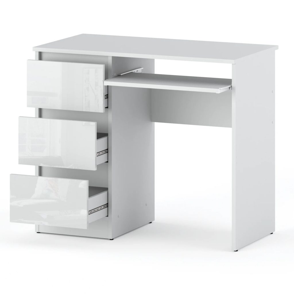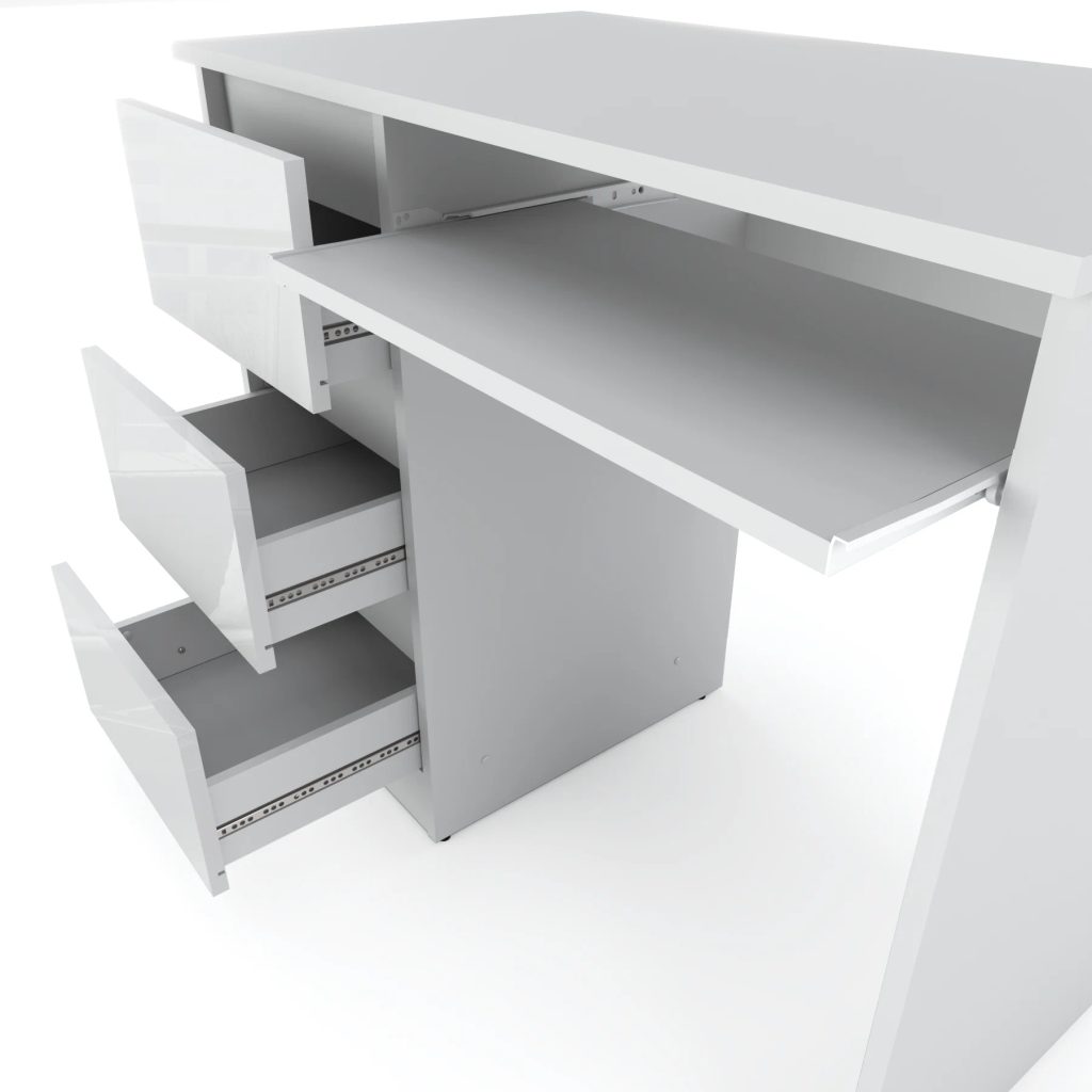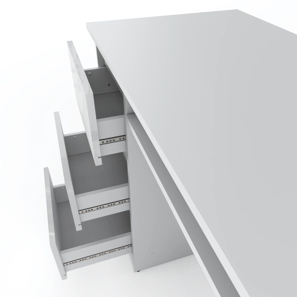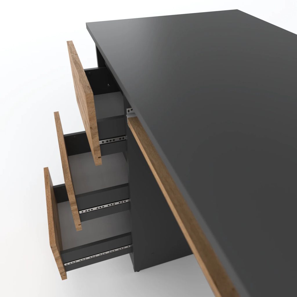 Vyrobený z nejkvalitnějších materiálů s vysokou odolností proti poškrábání, tento stůl nabízí nejen vizuální atraktivitu, ale také dlouhou životnost. Vybaven výsuvnou polici na pojezdech s válečky, zajišťující plynulé a bezproblémové otevírání. Moderní bezúchytkové otevírání objemných zásuvek nejen zvyšuje praktičnost, ale přidává i šmrnc současnému designu.