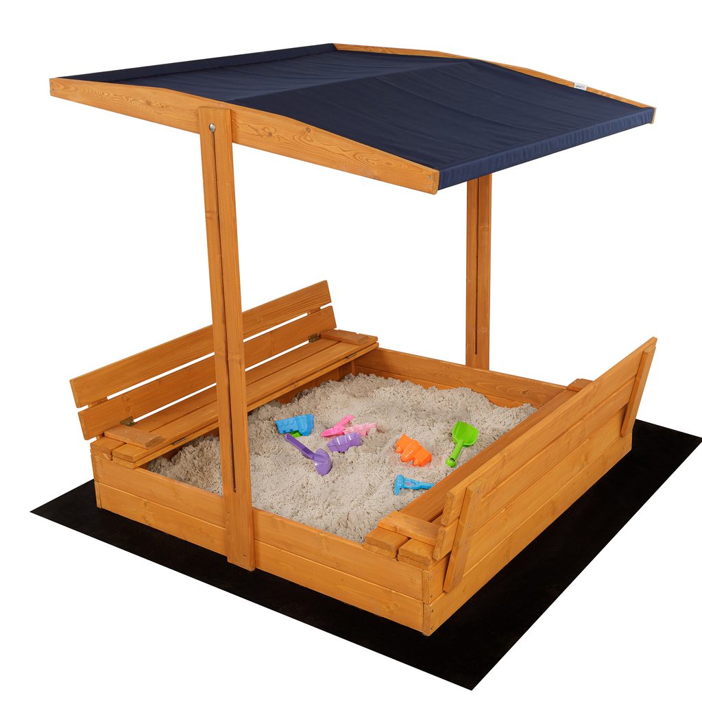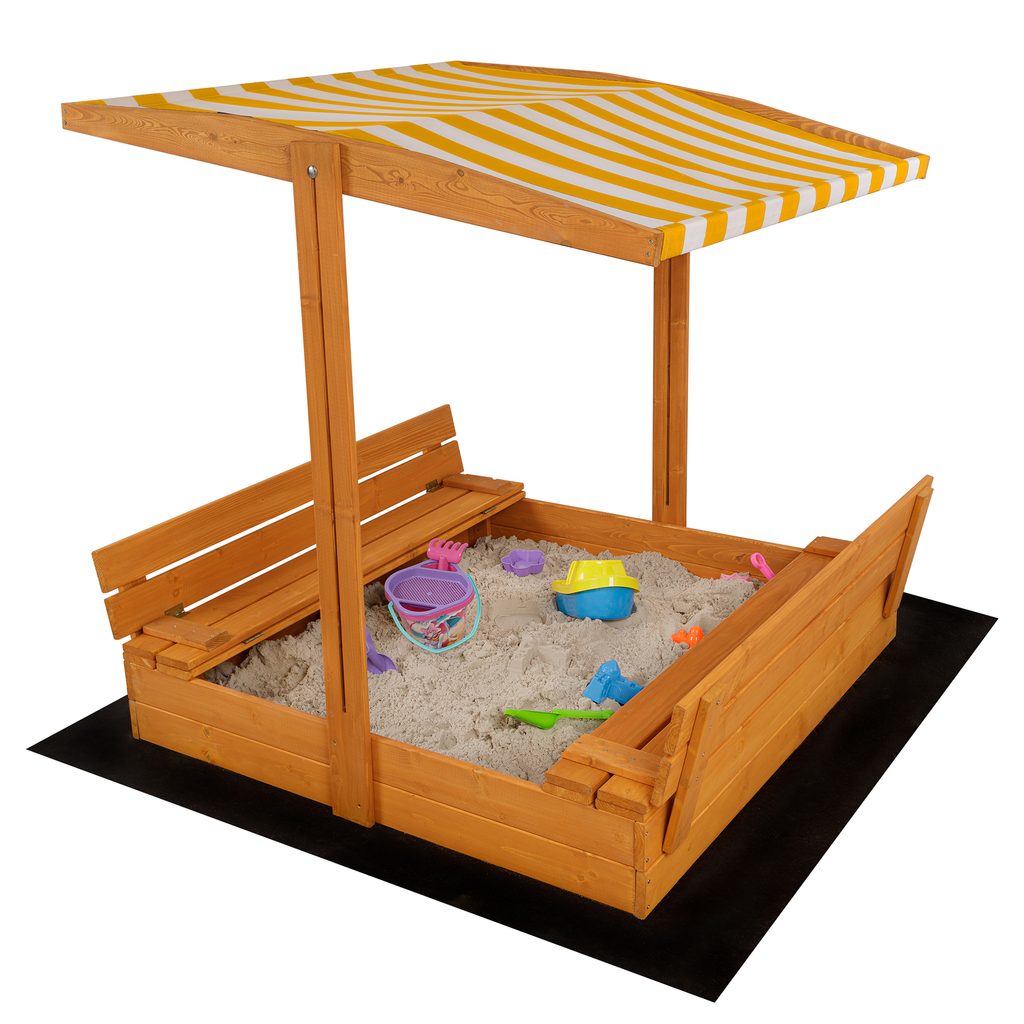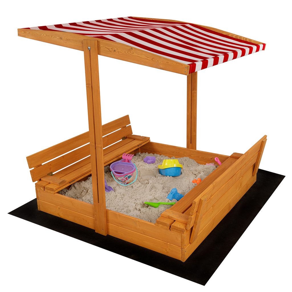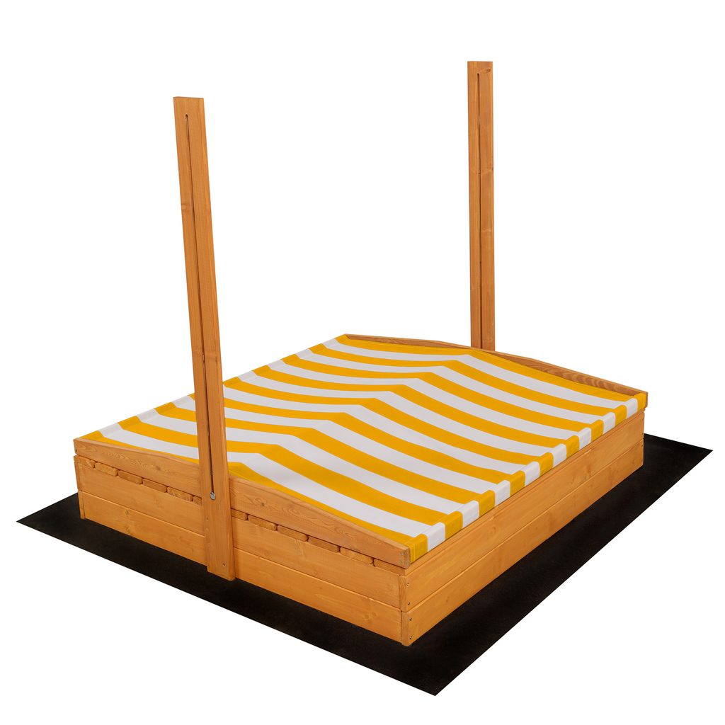 - Součástí balení je dřevěné pískoviště, agrotextilie, plachta, stříška a lopatka na pískoviště